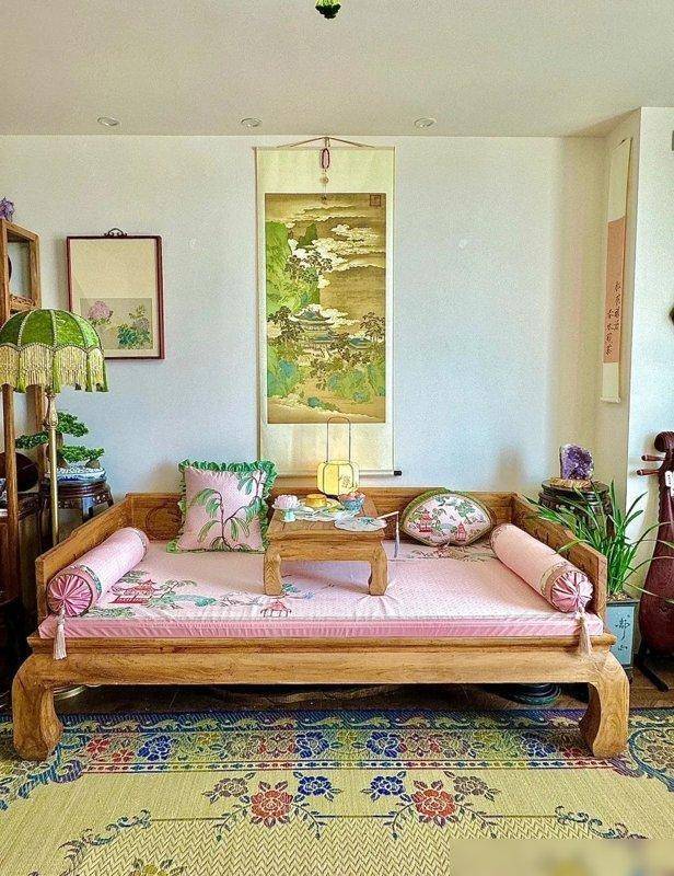 你看她选的罗汉床,北方老榆木的白胚,自己亲手烫蜂蜡、涂花梨色木蜡油,那质感不是家具城卖的“新红木”能比的——就像老茶缸子泡的茶,比奶茶店的果茶多了层“岁月的润劲儿”。我朋友之前装新中式,咬咬牙买了套大红木沙发,结果客厅塞得满满当当,坐上去像进了博物馆,连追剧都不敢吃薯片怕蹭脏。可这姑娘的罗汉床不一样,矮矮的、敦敦的,既当沙发又能躺,周末蜷在上面看剧,旁边摆个自己收的青瓷小茶杯,这不就是“把宫廷的精致揉进日常”吗?